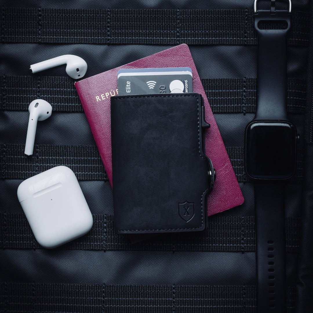 Simple, elegante y compacto. Diseñada para ahorrar espacio y simplificarte la vida. Todas tus tarjetas a un botón de distancia. Este modelo cuenta con tecnología RFID anti-clonación que impide la clonación de tarjetas a través de ondas. Cuenta con una capacidad de hasta 6 tarjetas en el tarjetero deslizador y 6 adicionales en los compartimientos interiores.