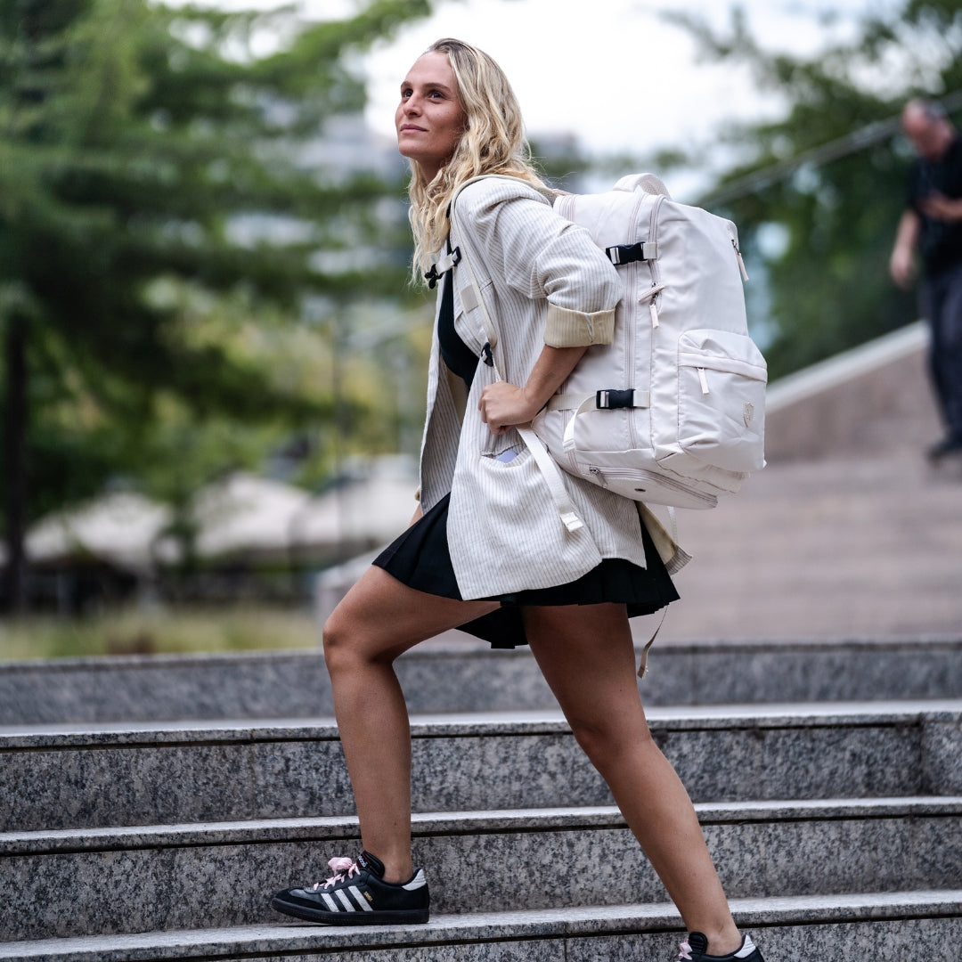 Mochila para viajes expandible de 29 a 39 lts, disponible en Blanco y Negro. Destaca por su peso ligero, espalda ergonómica y convenientes compartimientos para que lleves tus zapatillas, notebook y botella de agua de manera cómoda y eficiente.