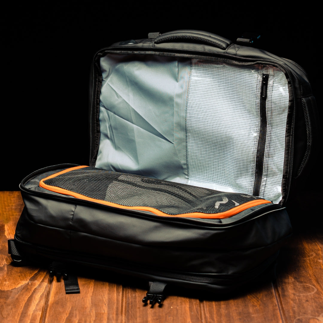 Por otro lado, tienen diferencias en sus diseños. La Grand Travel se abre como una maleta y tiene una malla con bordes naranjos en el compartimiento principal para separar y ordenar tu ropa. Además, es un poco más compacta.