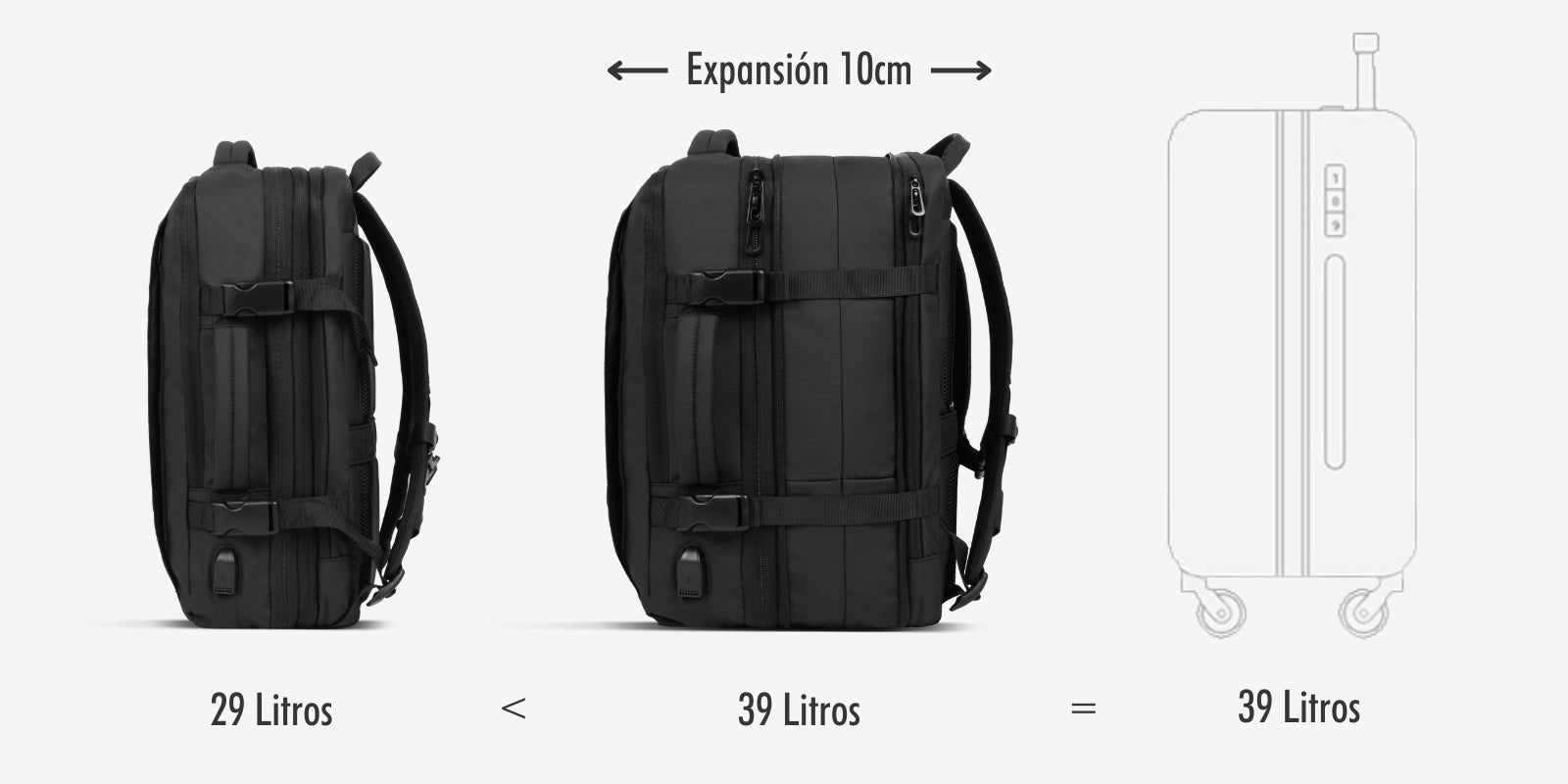 - Diseño expandible de 29 Litros a 39 Litros.