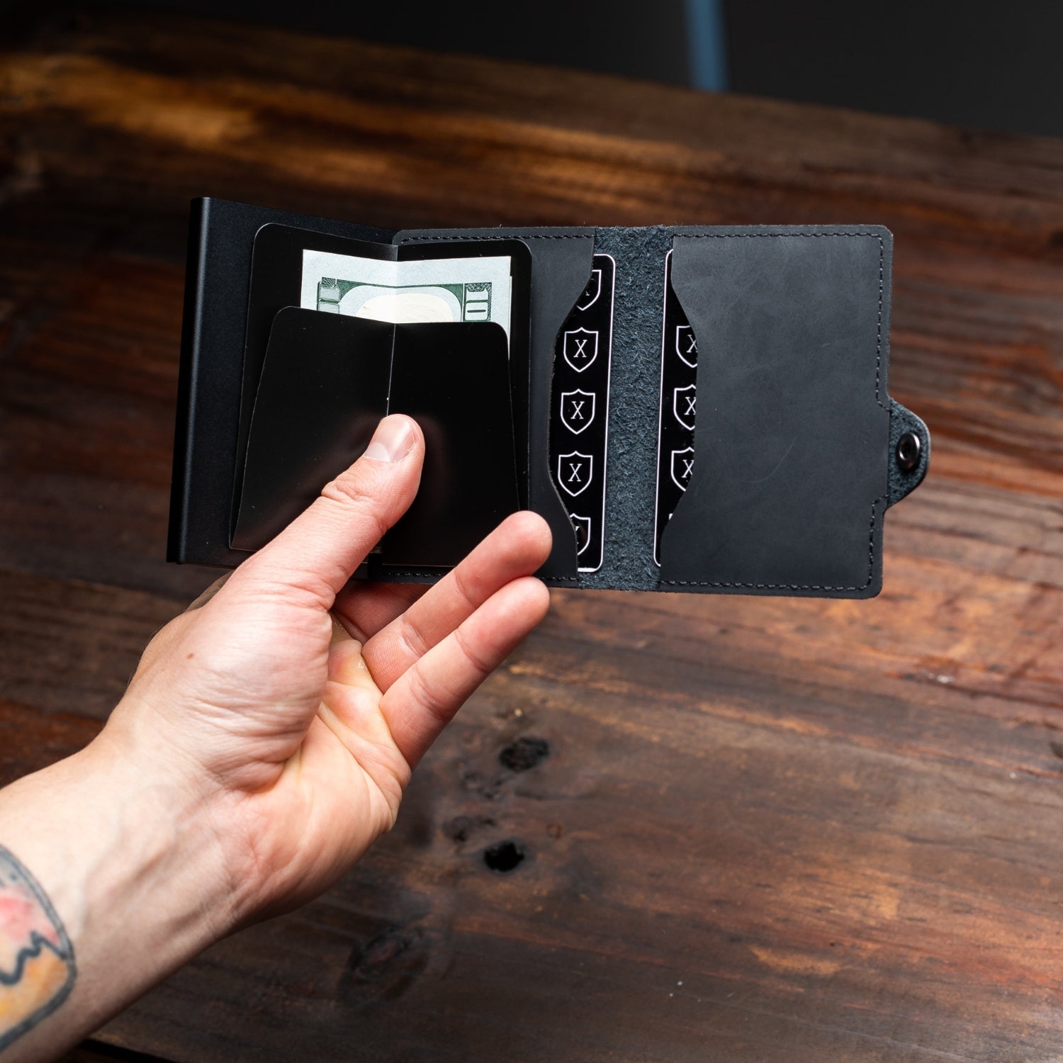 - Tarjetero con deslizador incorporado con capacidad para 4-6 tarjetas, además, cuenta con bolsillos interiores para 4-6 tarjetas adicionales llegando a un total de 8-12 tarjetas por billetera.